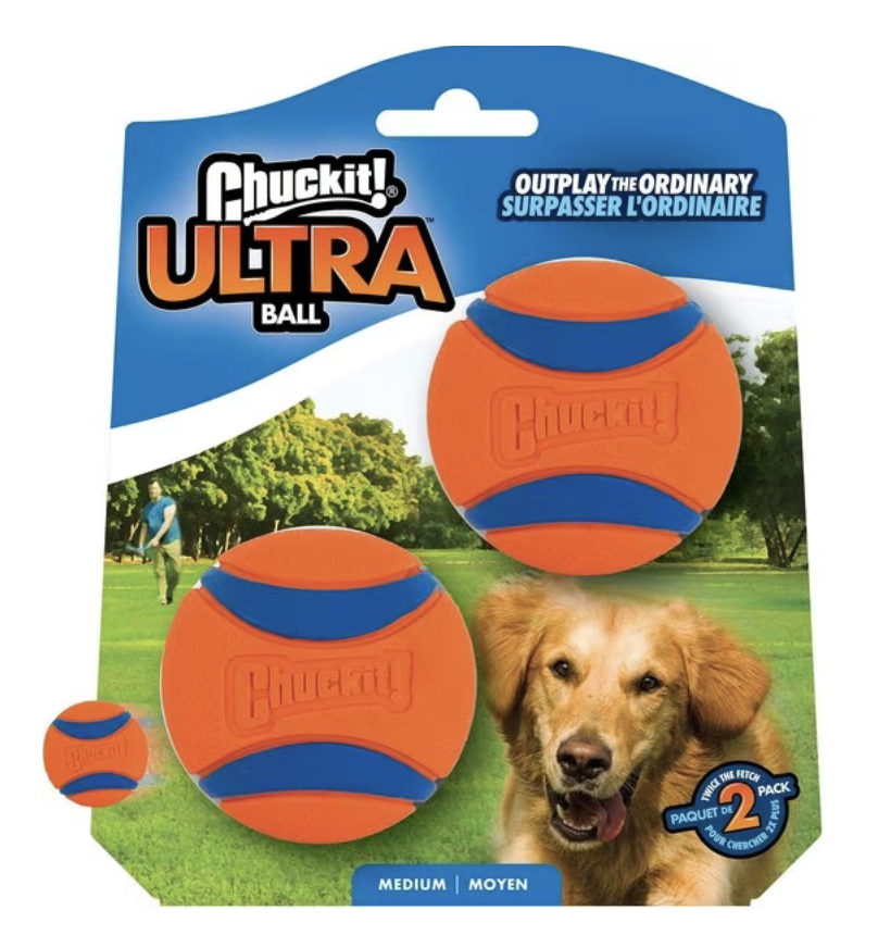 Did you know regular tennis balls can actually wear down your dog’s teeth over time due? Tennis balls can be much more abrasive than you might think and can contribute to significant visible teeth wear. Chuckit balls area great alternative! They come in a variety of sizes and you can also get them with a handle for dogs that like to tug.